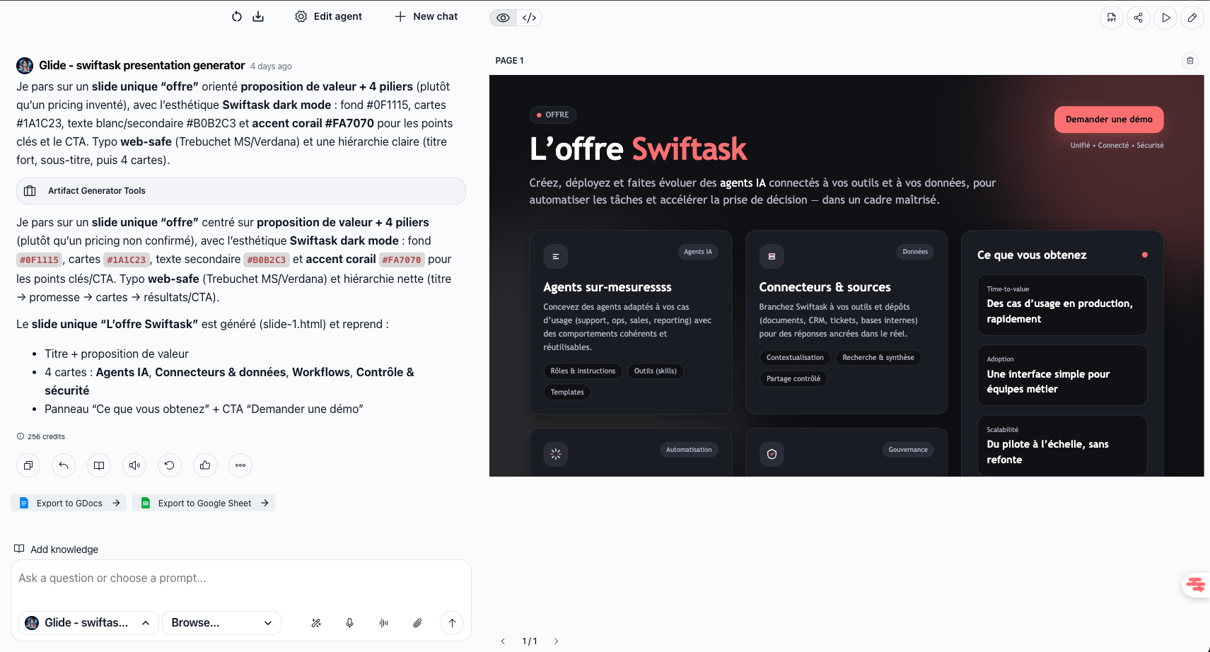 You can now create professional presentations and interactive web pages with AI Agent in minutes. Describe what you need and Swiftask builds complete, ready-to-use content—no design or coding skills required.