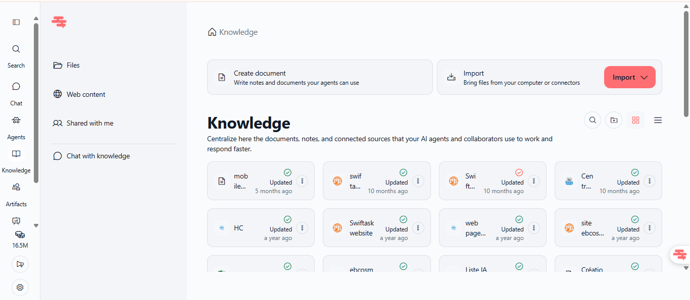 As a reminder, the Knowledge feature in Swiftask allows you to centralize all your company data: documents and knowledge in an unified system. Knowledge acts as your team's virtual storage, it keeps everyone synchronized and ensure that AI agents always have access to your company's latest information.