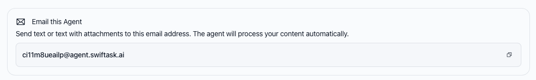 Unique email address per agent: Every agent gets a dedicated email address (e.g., agent-slug@swiftask.ai) allowing direct communication via standard email clients